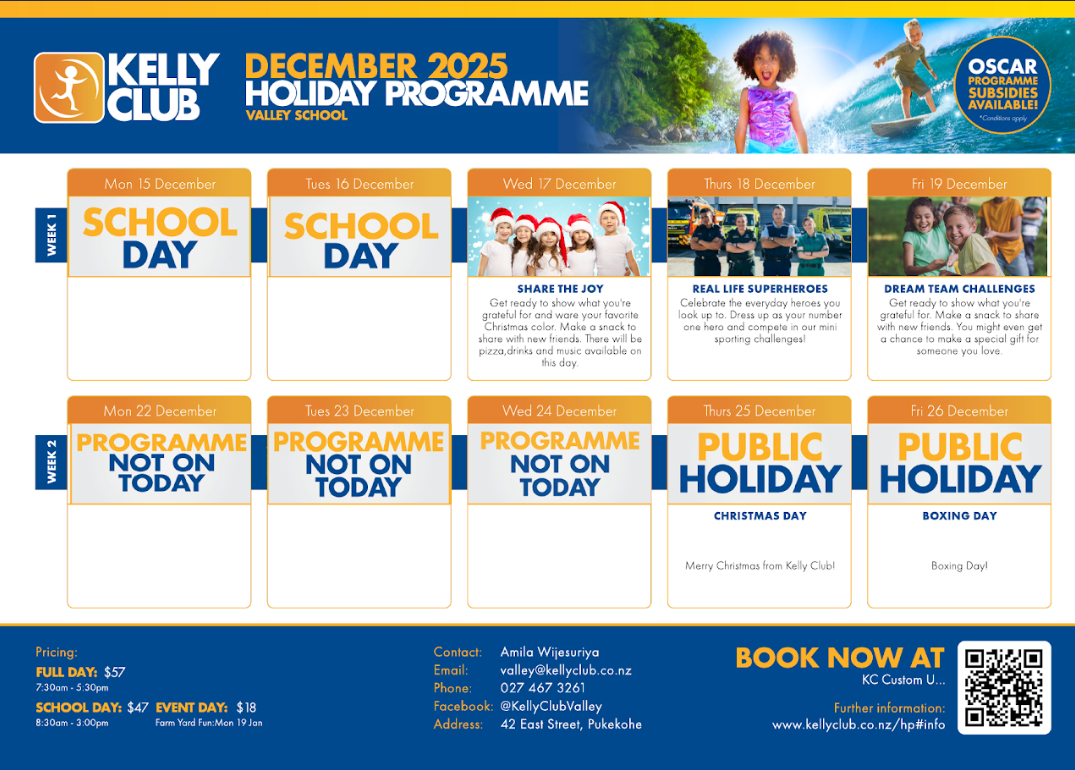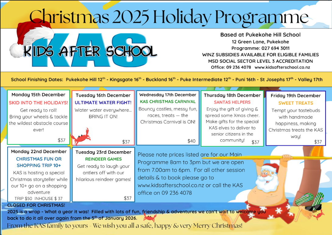 We are celebrating the wonderful year that was 2025 as well as farewelling our Year 6 Graduates. Everyone is welcome to join us at 1pm on Tuesday 16th December at St Patrick’s Pukekohe. To help support our Parish Christmas Appeal we ask all families to contribute a non-perishable food item. These can be brought into school over the next two weeks and handed in to your child’s classroom teacher.
