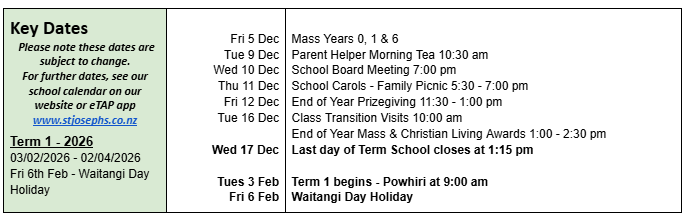 Our annual prize-giving will be held next Friday at 11:30 am. While some children will receive prizes for special achievements, we want to acknowledge that all our ākōnga have made progress and shown success in a variety of ways over the year, as every child is blessed and precious. Please note that school reports and 2026 placement letters will be sent home next Friday afternoon.