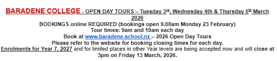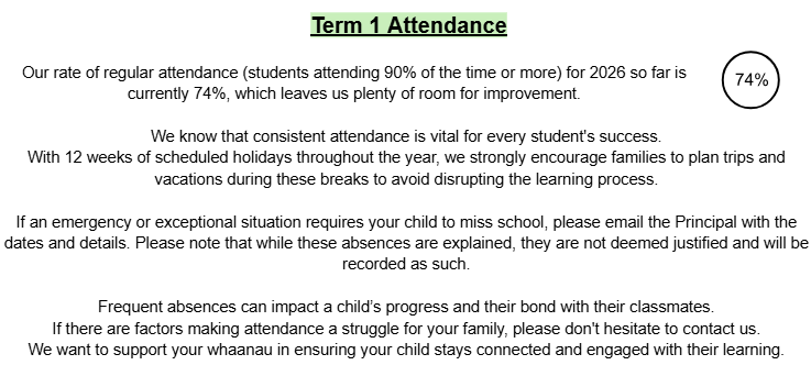 The Ministry of Education’s priority for 2026 continues to be Attendance and Achievement; improved attendance supports improved achievement. The MOE’s goal is that 80% of students attend more than 90% of the time. This year, all schools have to have an Attendance Management Plan in place. The emphasis will be on the individual students and how often they attend. Please continue to inform the school of your child’s absences. If your child is regularly absent, or has patterns of absence, I will be contacting you.
