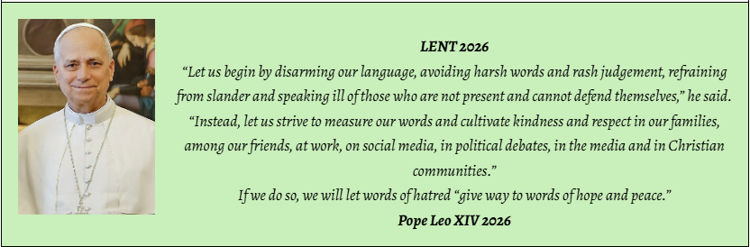 Lent is a time of preparation for Easter Sunday, the most important celebration in our Catholic Church. Lent is a time for us to renew our baptismal promises through prayer, charity, and fasting. Pope Leo suggests that we fast from words and disarm language that wounds, that we speak kindly to and of others. At St Joseph’s, we will be encouraging everyone to do this.